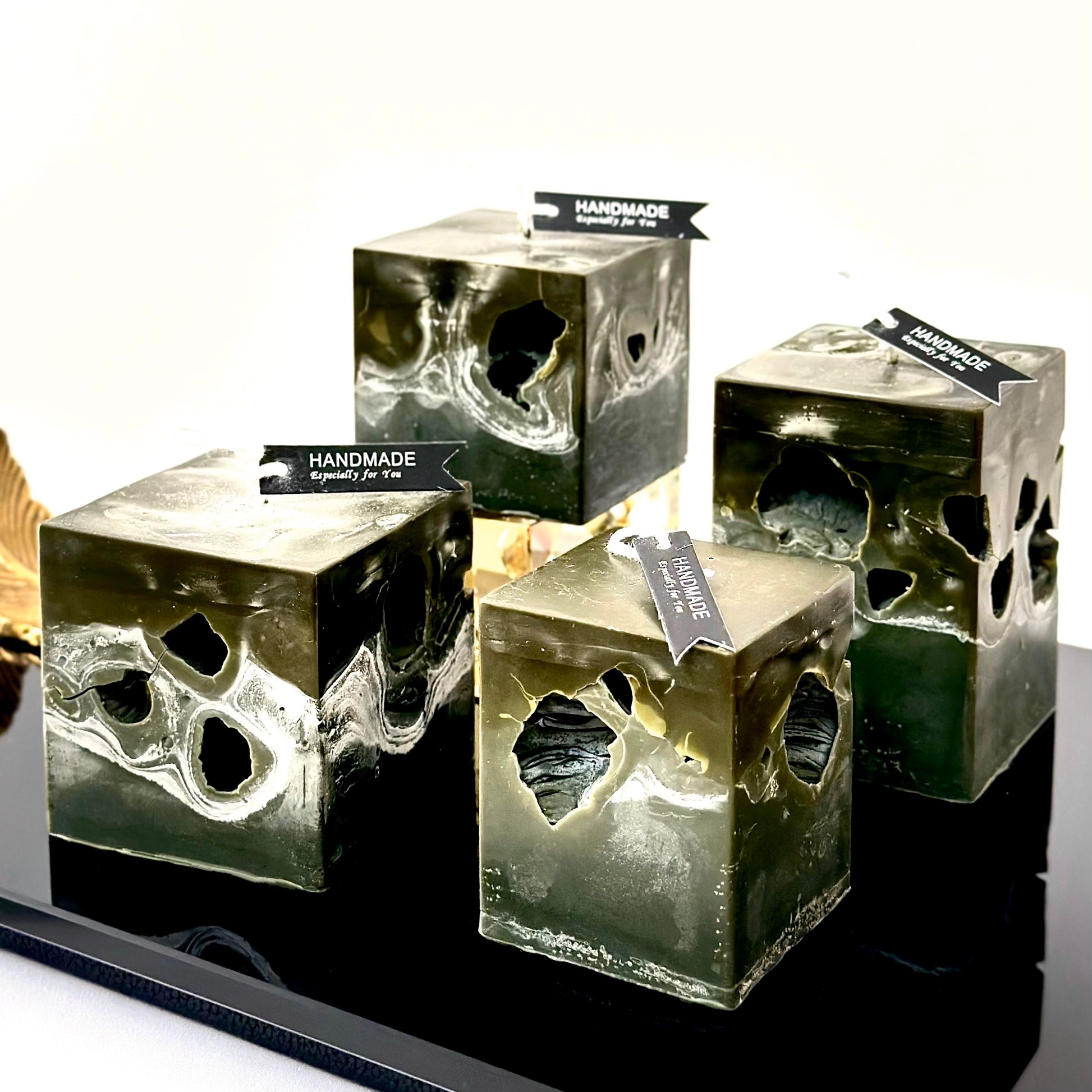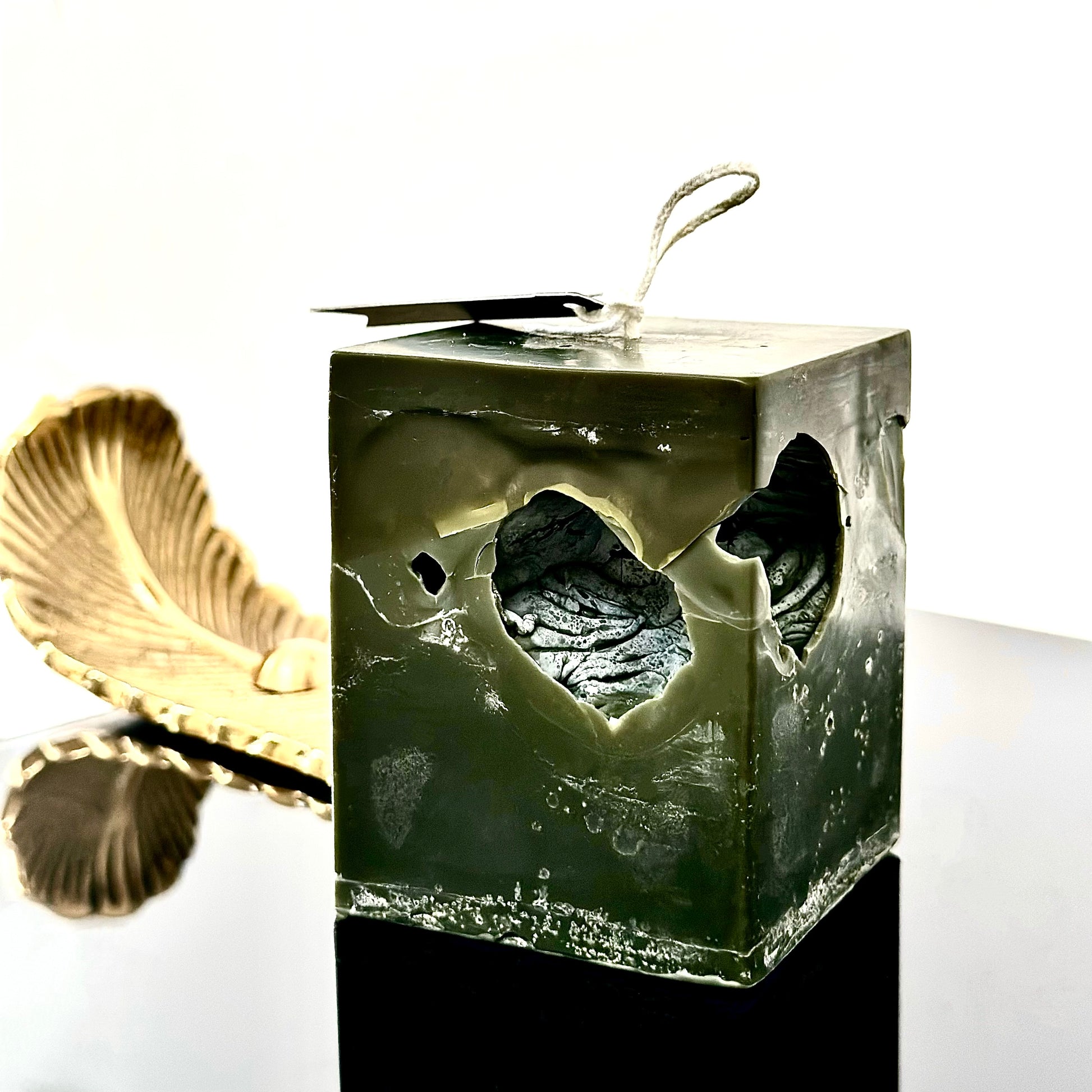 Aether Hollows reveals the quiet beauty of absence. Sculptural voids catch and soften light, while mineral marbling recalls stone veined by time. In Deep Green, mossed rock meets glacial calm—shaded wax opening into luminous hollows.