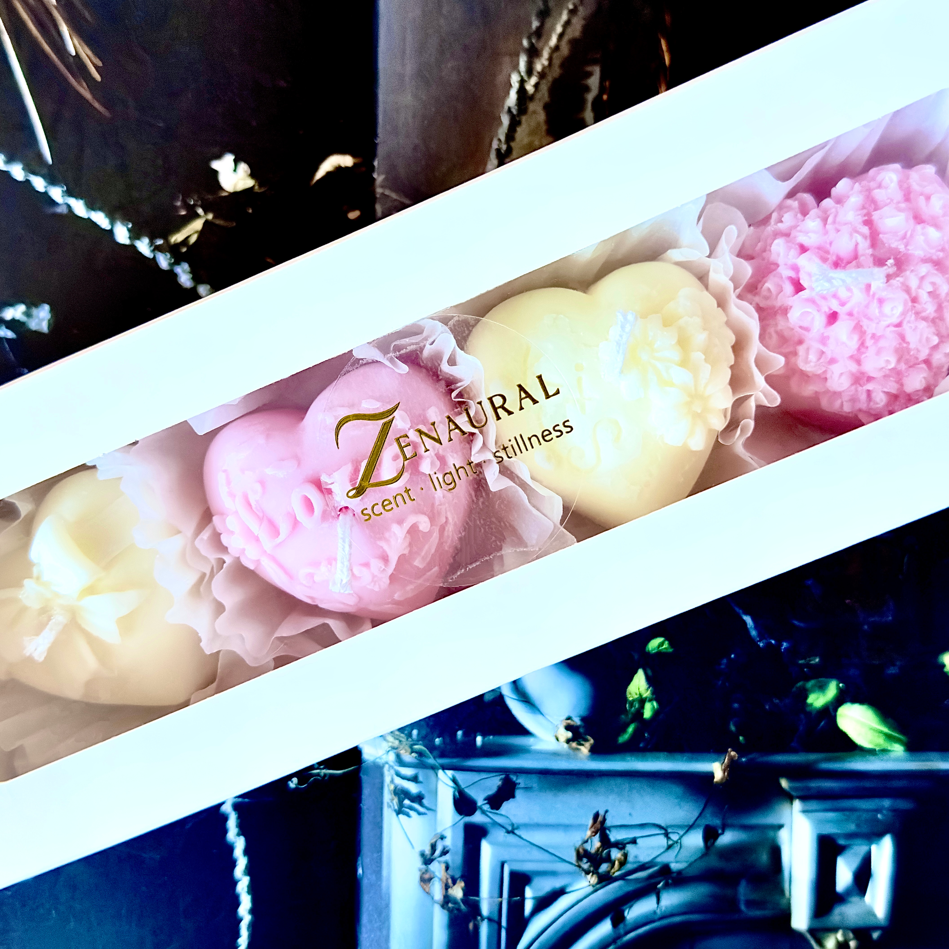 Light first, melt after. A balanced duet of blush and white—four hearts that glow with a petite flame, then live on as melts for long-lasting fragrance.