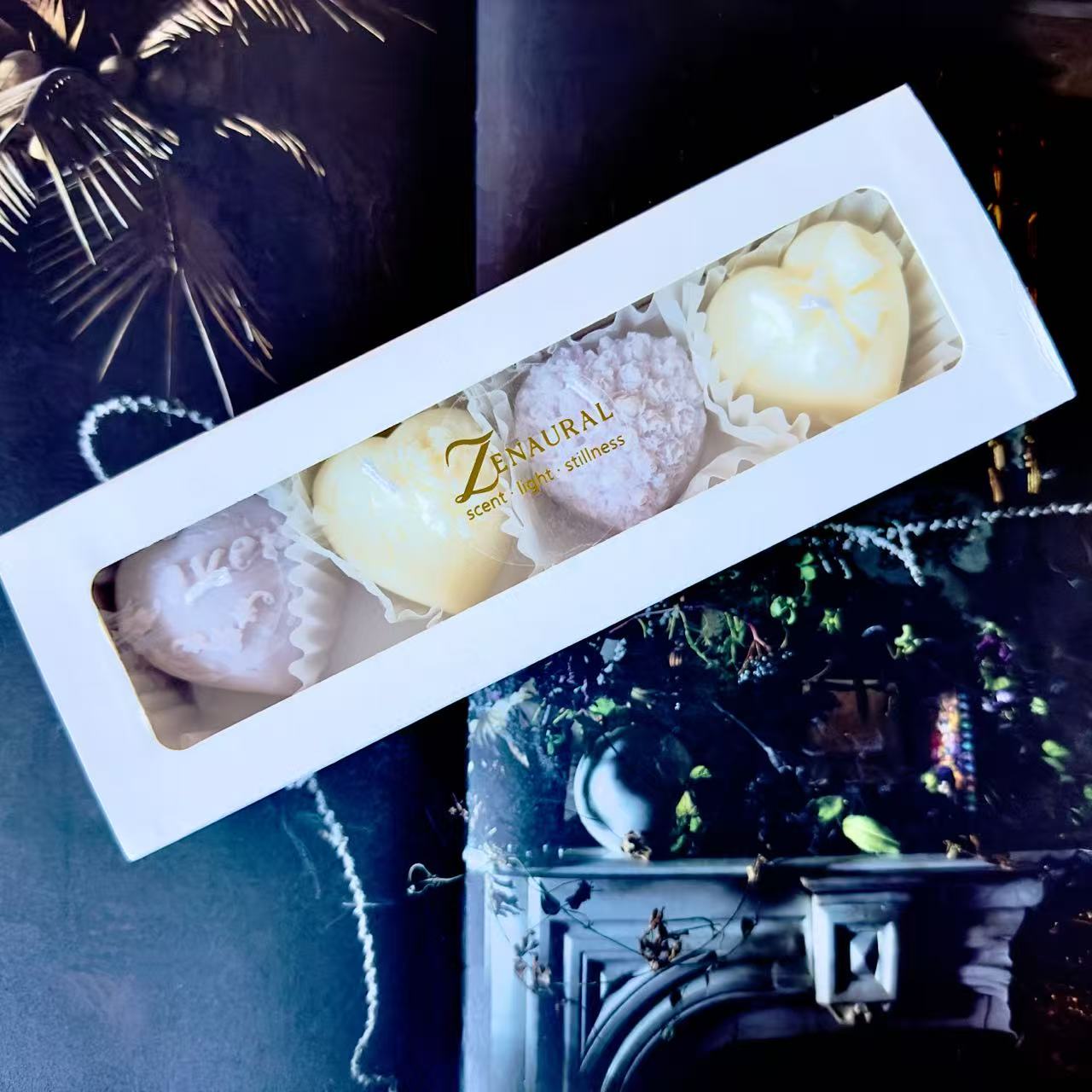 Light first, melt after. A serene pairing of violet and white—four hearts that begin with a gentle flame, then continue as melts for enduring fragrance.